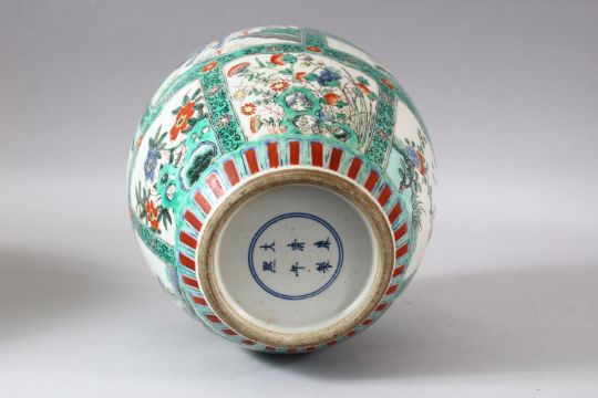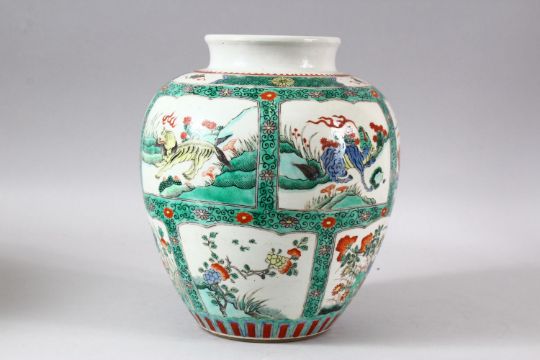 A CHINESE KANGXI STYLE FAMILLE VERTE PORCELAIN JAR - decorated with panels of animals and flora - the base with a six character mark 24cm