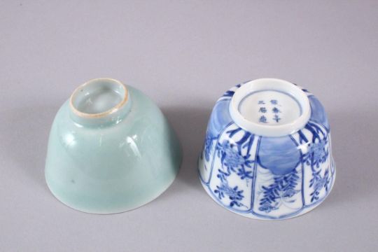TWO CHINESE PORCELAIN BOWLS, one kangxi style with panel decoration of flora, the base wwith a six character mark, the other with a celadon glaze, 8.5cm & 9cm