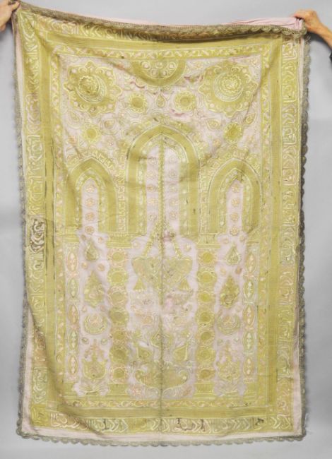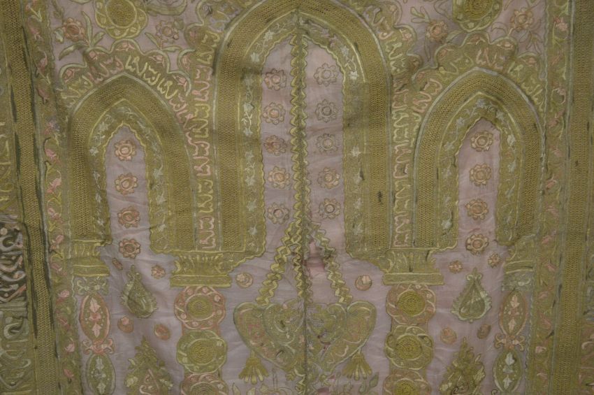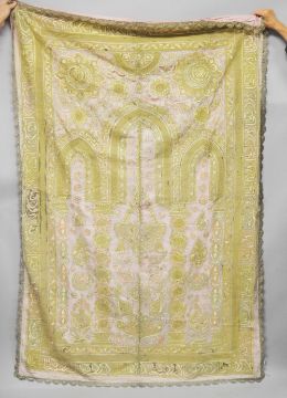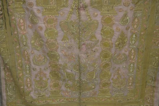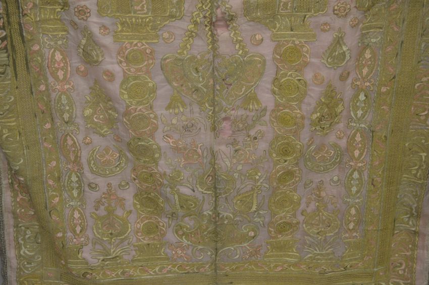 A LARGE OTTOMAN EMBROIDERED SILK PANEL, embroidered with panels of calligraphy and motifs.