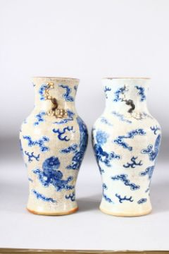 A PAIR OF CHINESE BLUE AND WHITE CRACKLE GLAZE TWIN HANDLE VASES, the body of each painted with kylin amongst stylised clouds, the handles naturalistically moulded in the form of prunus blossom, mark to each base, both approx. 35cm high.