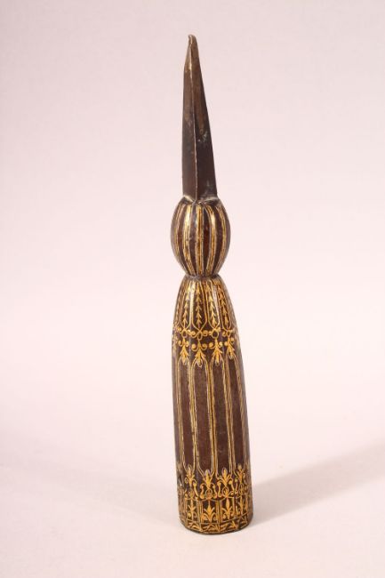 A FINE 19TH CENTURY OTTOMAN GOLD INLAID STEEL SPEARHEAD, 20cm long.