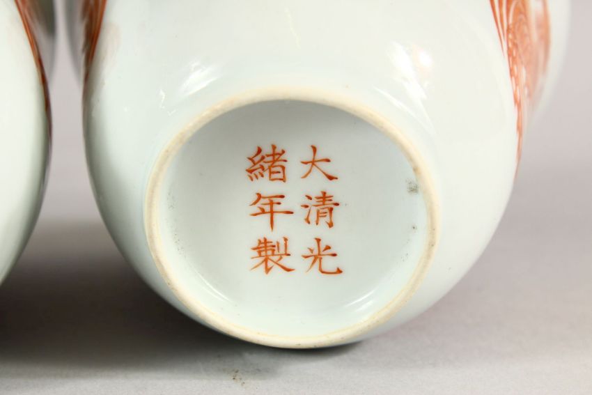 A PAIR OF RED AND WHITE CUPS, each with four panels of dragons and phoenix, 9.5cm high.