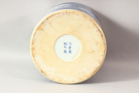 A LARGE CHINESE BLUE AND WHITE BRUSH POT, decorated with deer in a landscape setting, six character mark to base, 18cm high.
