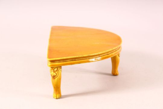 AN UNUSUAL CHINESE YELLOW GROUND GLAZED PORCELAIN STAND, supported on three moulded mask and paw feet, 25cm x 13.5cm.