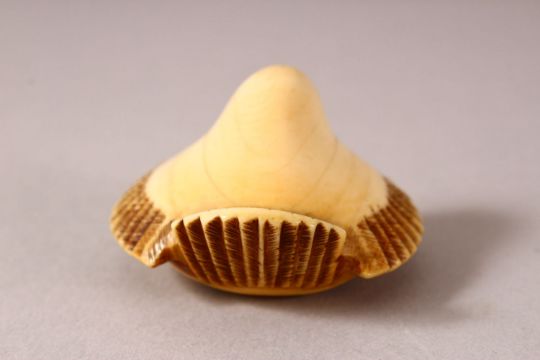 A JAPANESE MEIJI PERIOD CARVED IVORY NETSUKE - FUKURA SUZUME - carved with its feet underside and a seal signature " Masanao " 4cm