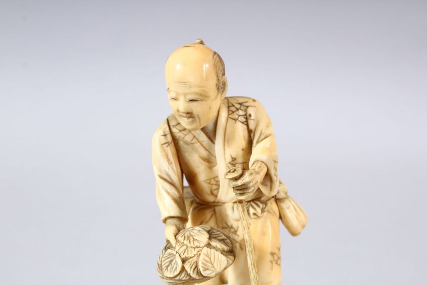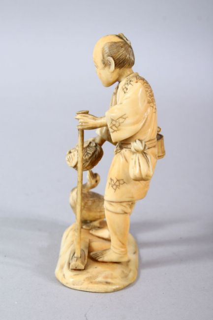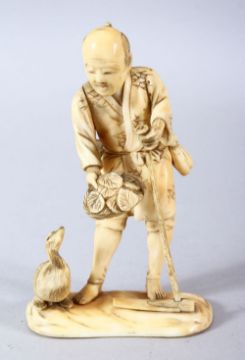 A JAPANESE MEIJI PERIOD CARVED IVORY OKIMONO - the man stood holding his plough with a duck to one side, the underside with a carved signature - 12cm
