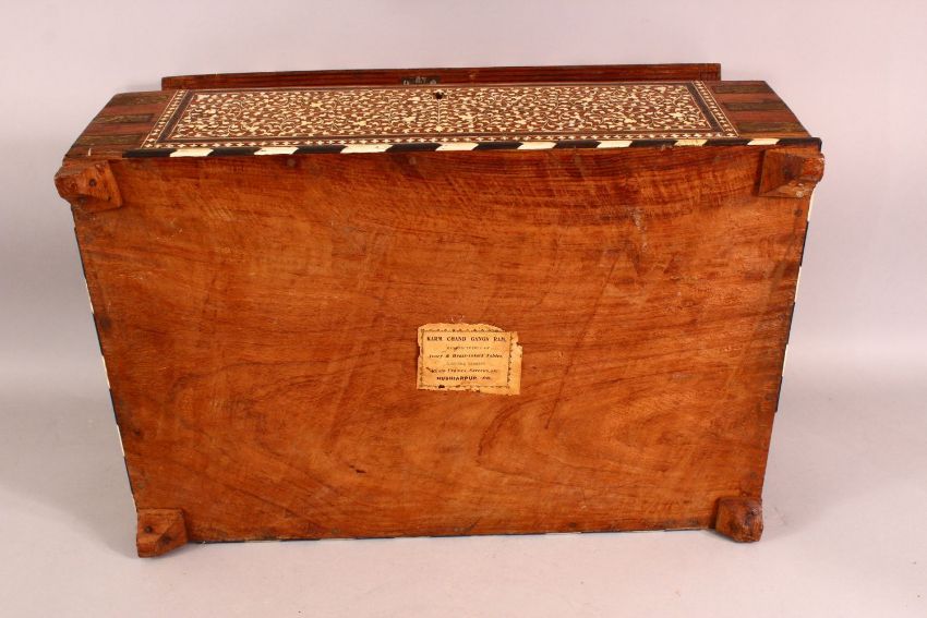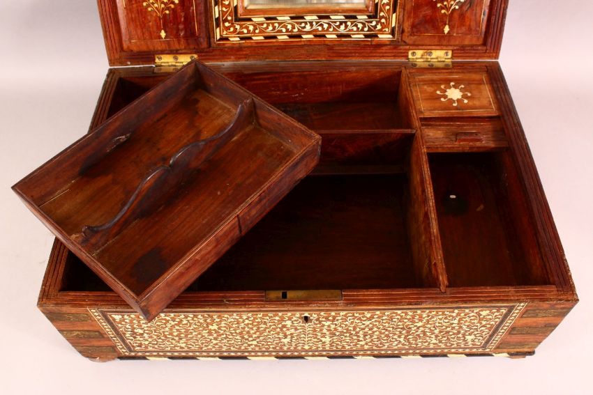 A FINE 19TH CENTURY INDO PERISAN INLAID BONE EBONY & BRASS VANITY BOX - the box profusely inlaid with carved bone to depict scrolling foliage - with bone & ebony side inlay - and metal mounts - opening to reveal storage sections and a mirror - 18cm high x 46cm wide x 31cm
