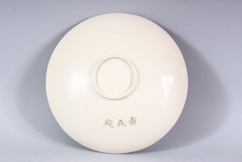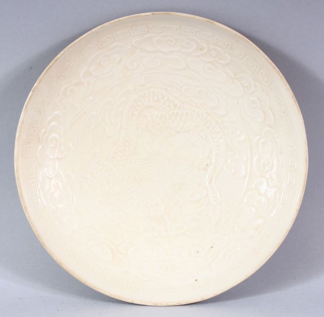 A CHINESE SONG STYLE DING YAO PORCELAIN PLATE - the interior with dragons and clouds - the underside with gilt mark 20cm