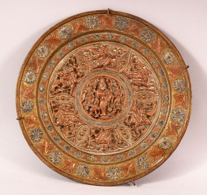 A FINE 19TH CENTURY INDIAN TANJORE BRASS, COPPER AND SILVER DISH, with panels of relief winged figures surrounding a central roundel containing a deity, 23cm diameter.