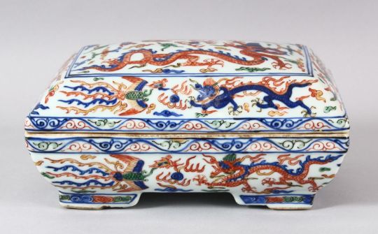 A CHINESE MING STYLE WUCAI PORCELAIN RECTANGLAR BOX AND COVER, painted with dragons and phoenix, the base with blue six character mark, 20cm x 13.5cm.