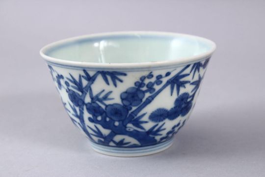 A GOOD CHINESE BLUE & WHITE MING STYLE PORCELAIN BOWL, decorated with pine trees and bamboo, the base with a six character mark. 9cm.
