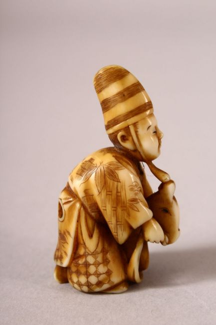 A JAPANESE MEIJI PERIOD CARVED IVORY NETSUKE - BOY & HOBBY HORSE - the boy depicted riding upon his hobby horse, signed " Mitsumasa " 5cm