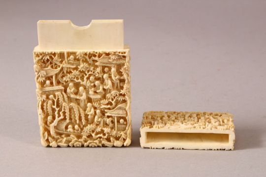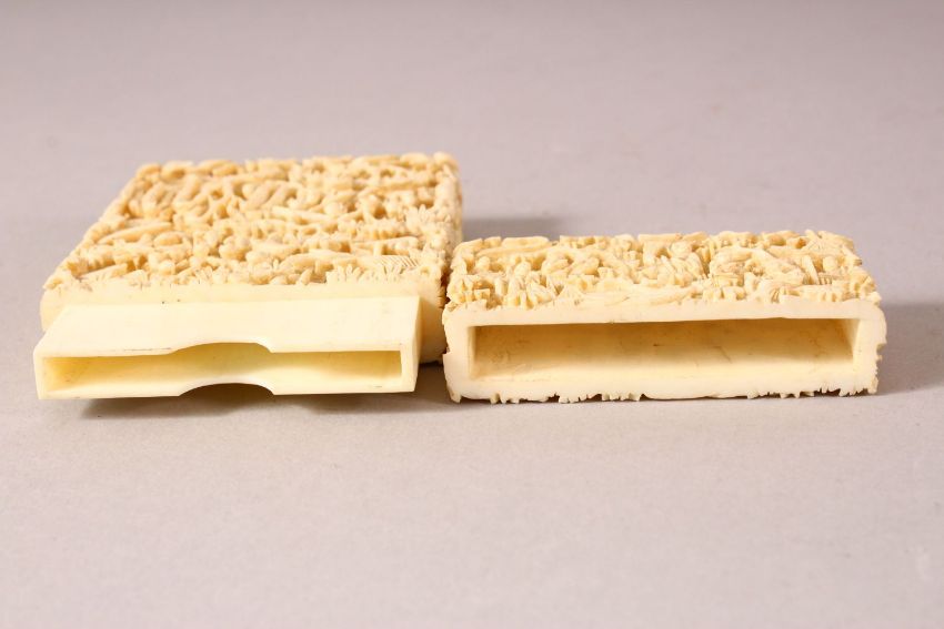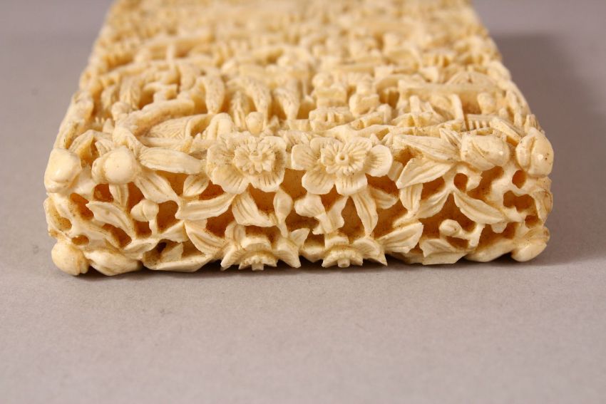 A FINE 19TH CENTURY CHINESE CANTON CARVED CARD CASE - finely carved in deep relief depicting figures aside temple building and foliage - unusually with peach borders - 10.5cm x 6.5cm