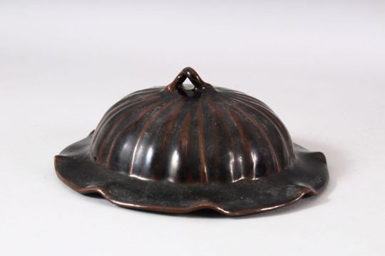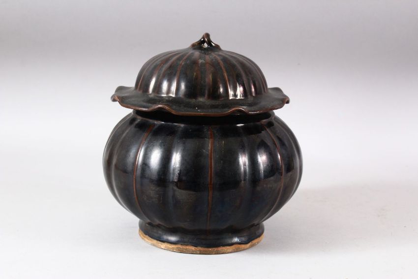 A CHINSES RIBBED BODY BROWN GLAZED JAR & COVER - the jar with a ribbed body, the cover with a twisted root finial, 22cm high