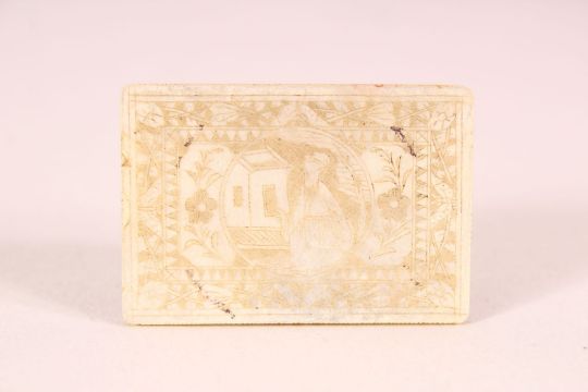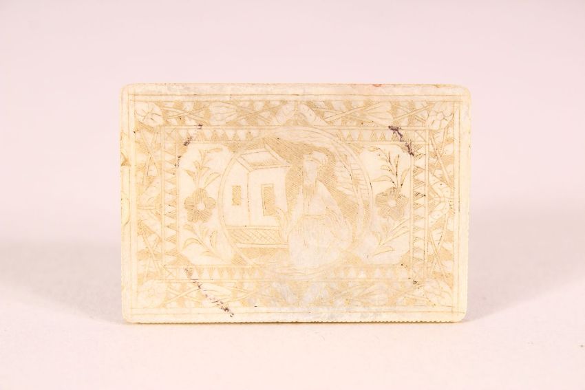 A JAPANESE IVORY SHIBAYAMA BEZIQUE MARKER, together with a rectangular mother of pearl counter, bezique marker 9cm x 6cm.
