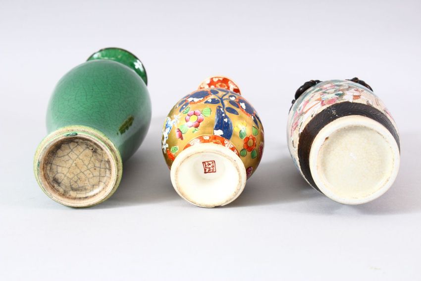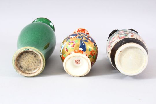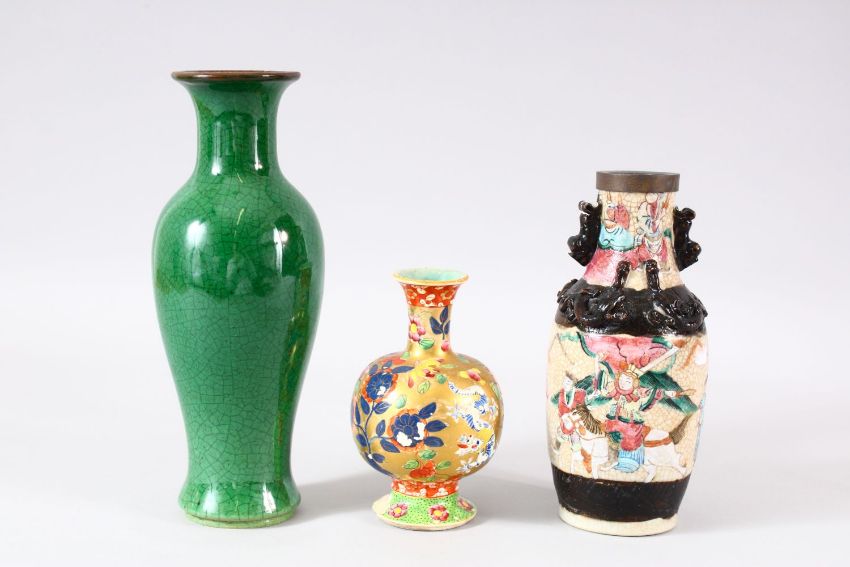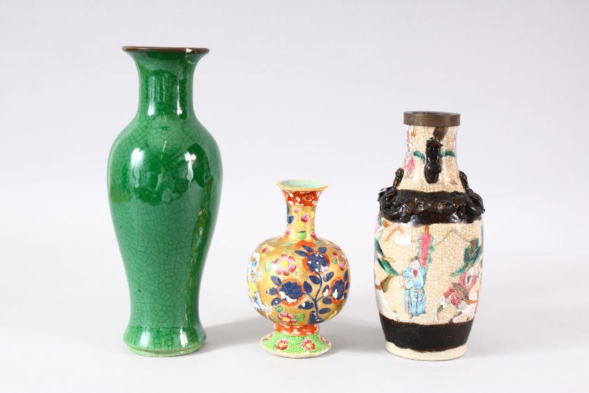 A MIXED LOT OF THREE CHINESE PORCELAIN ITEMS, comprising one small famille rose carnival vase, decorated with figures upon horseback, twin handles and chilong, ground top 18cm. also with a small globular famille rose porcelain floral vase, with a chip 13cm, together with an apple green glaze crackle ware porcelain vase, rim damage, 22.5cm. (3)