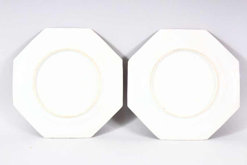 A PAIR OF CHINESE FAMILLE ROSE OCTAGONAL PORCELAIN PLATES - each decorated with twin dragons chasinig the pearl amongst clouds - with smaller borders of birds and flora - 20cm