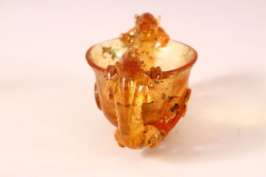 A CHINESE PEKING AMBER GLASS TWIN HANDLE CUP, with twin beast handles, 10cm wide.