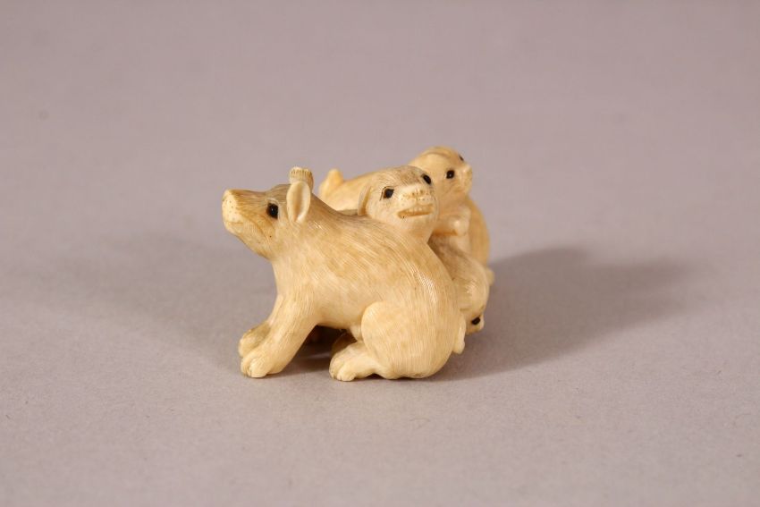 A JAPANESE MEIJI PERIOD CARVED IVORY NETSUKE OF A BOAR AND DOGS - the boar / pig seated aside four puppy dogs, the underside signed " Tadatoshi" 3.9cm