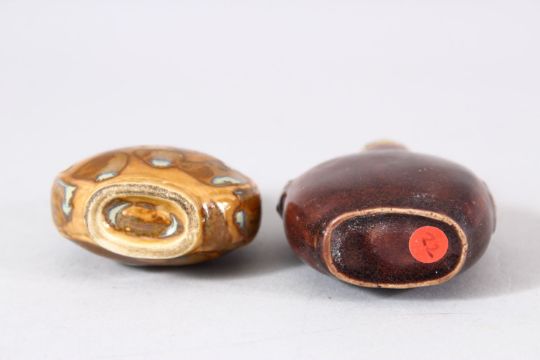 TWO CHINESE PORCELAIN SNUFF BOTTLES - one jun ware twin handle snuff bottle, the other of graduating patched colour. 7cm & 5.5cm