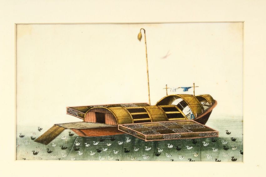 FOUR CHINESE PITH PAINTINGS, each depicting different styles of boats, framed as one, largest image 13cm x 22cm.