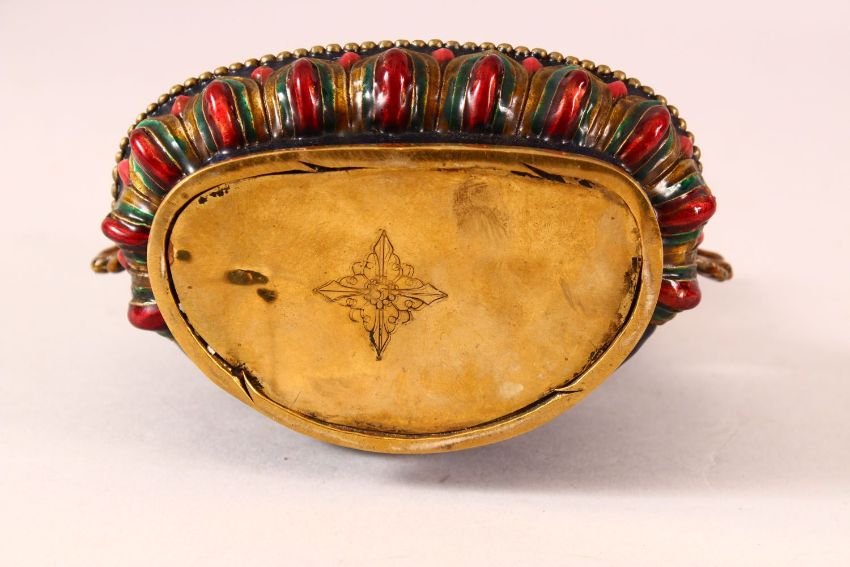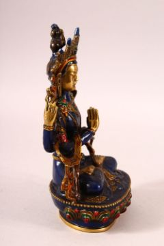 A FINE EARLY 20TH CENTURY THAI / TIBETAN ENAMELLED BRASS BUDDHA, with enamel decoration, 20cm high.