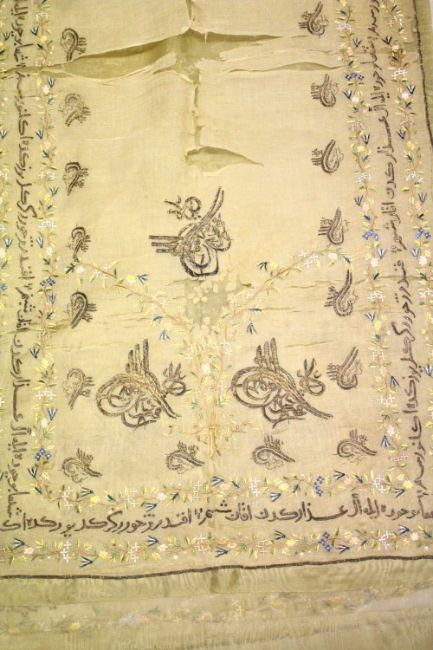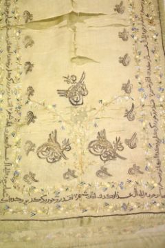 AN OTTOMAN EMBROIDERED SILK TABLE RUNNER, embroidered with calligraphy symbols and flora, (af).