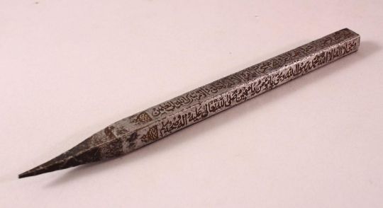 A FINE EARLY SAFAVID TELESMATIC STEEL CALLIGRAPHIC NAIL, with both arabic and Persian calligraphy work, 19.5cm