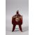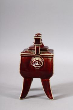 A CHINESE PEACH BLOOM GLAZED TWIN HANDLE LIDDED CENSER - stood on four curving feet with twin handles, the sides with raised lion dog mask decorations, the underside with a four character mark. 17cm