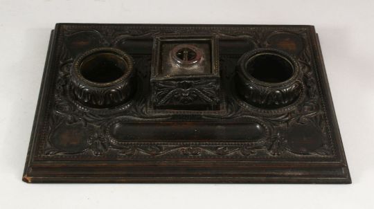 A 19TH CENTURY SRI LANKAN OR CEYLONESE CARVED EBONY DOUBLE SIDE DESK STAND, with cut glass central inkwell, 36cm wide.