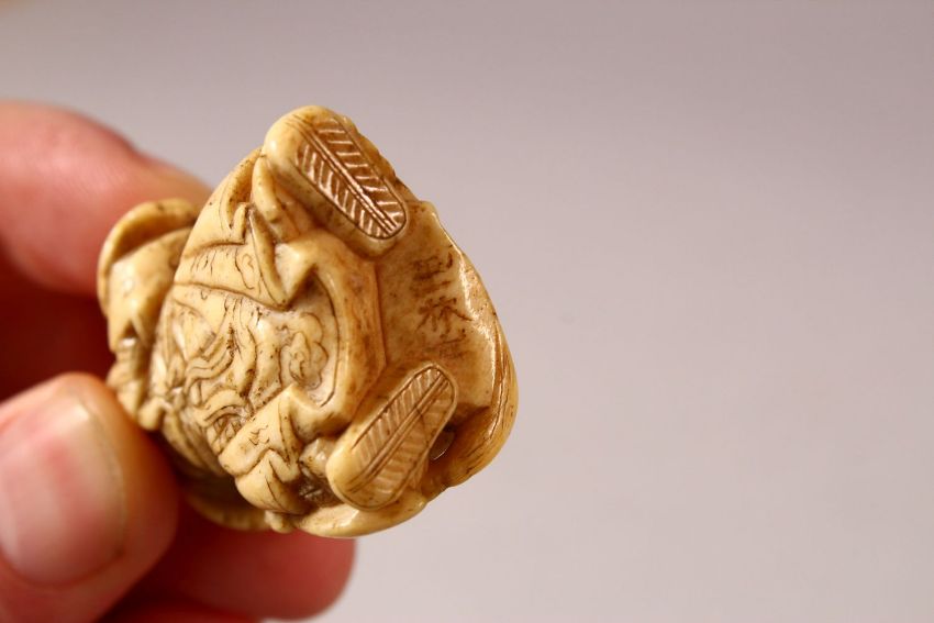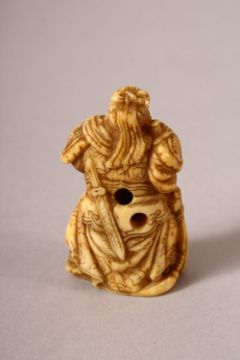 A JAPANESE MEIJI PERIOD CARVED IVORY NETSUKE OF A WARRIOR - the warrior stood in traditional attire holding his beard - the underside signed " Gyokurin / Gyokurinite " 4.5cm