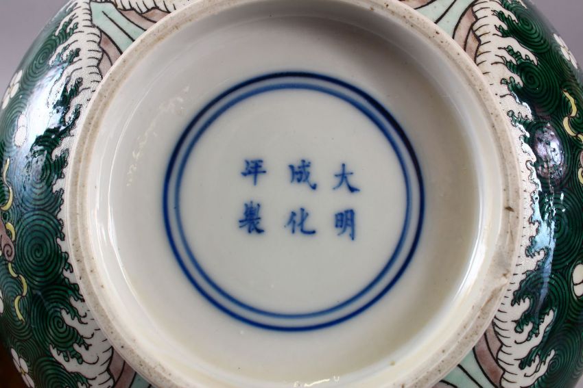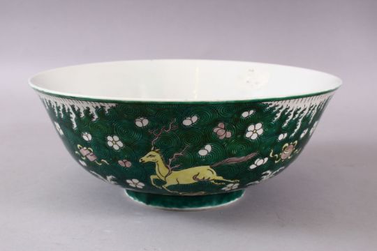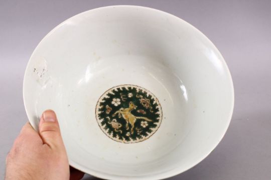 A 19TH / 20TH CENTURY CHINESE FAMILEL VERTE PORCELAIN BOWL, Decorated with horses uopn a wave ground with precious objects, the base with a six character mark, 27cm