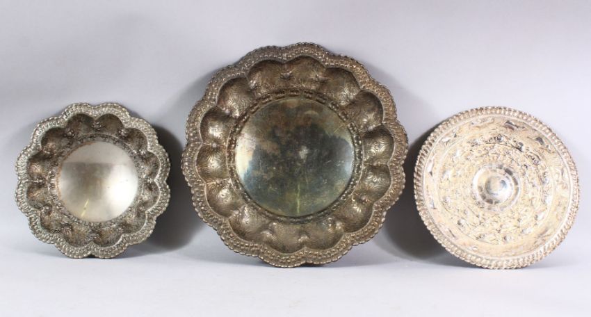 THREE INDIAN WHITE METAL EMBOSSED DISHES - each of varied design and size - 24cm - 34cm