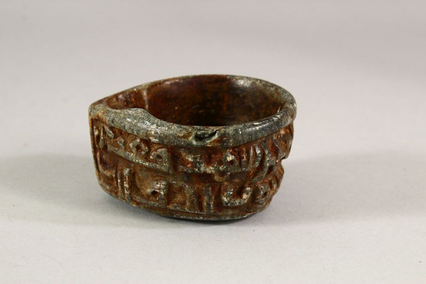 AN EARLY ISLAMIC CARVED STONE OIL LAMP, 8cm wide.