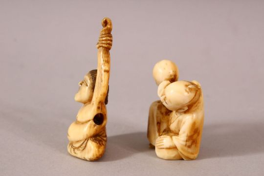 TWO JAPANESE MEIJI PERIOD CARVED IVORY NETSUKE - one depicting ashinaga the fisherman 5cm, together with a drunken man drinking from a gourd 3.5cm