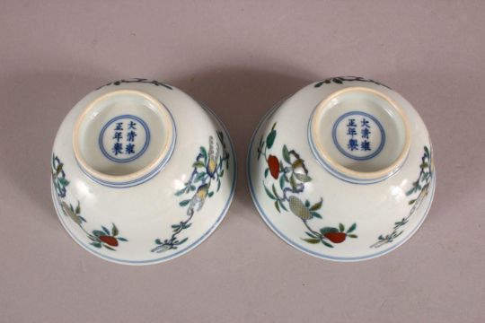 A PAIR OF 19TH / 20TH CENTURY CHINESE DOUCAI DECORATED BOWLS - each decorated with floral display and fruits - the base with a six character Yongzheng mark - 12cm