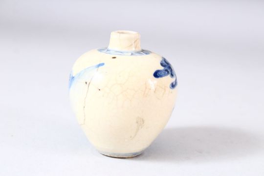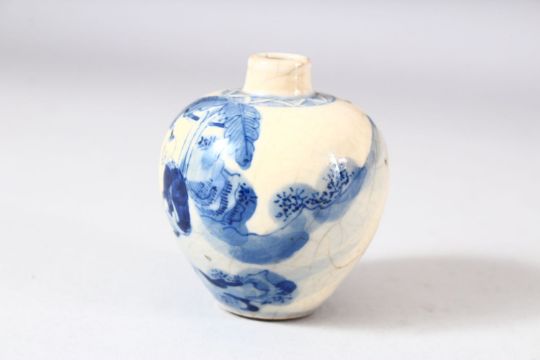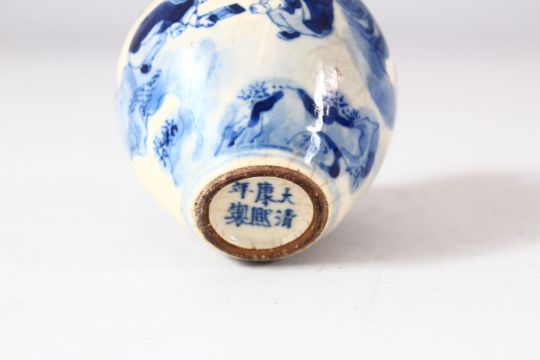 A CHINESE BLUE AND WHITE SNUFF BOTTLE, painted with two boys in a landscape setting, mark to base, 7cm.