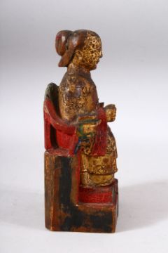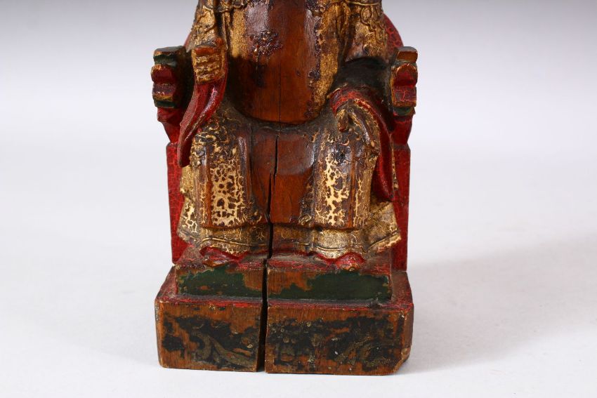 A CHINESE CARVED WOOD & LACQUER FIGURE OF A SEATED BOY - the boy sat upon23cm a chair leaning,