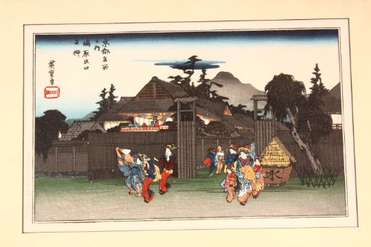 A JAPANESE WOODBLOCK PRINT, depicting figures aside mountains and temples, signed and sealed upper left, 52cm x 40cm.