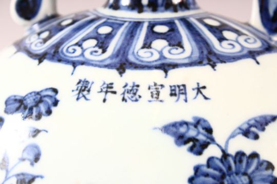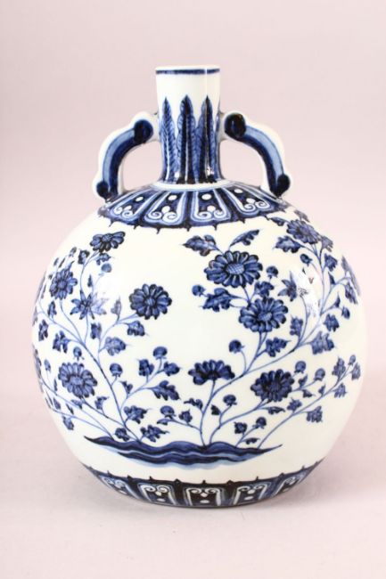A CHINESE BLUE AND WHITE TWIN HANDLE PORCELAIN MOON FLASK, decorated with flowers, six character mark below neck, 27.5cm high.