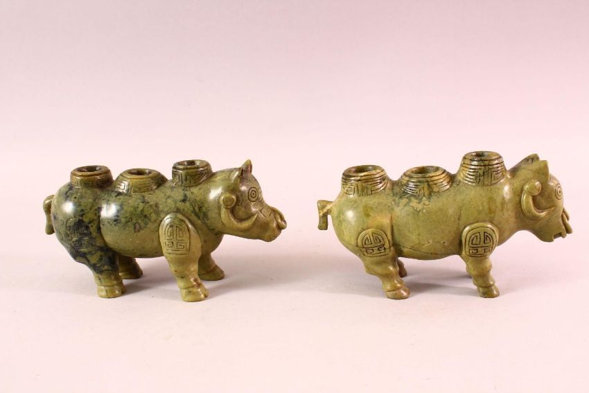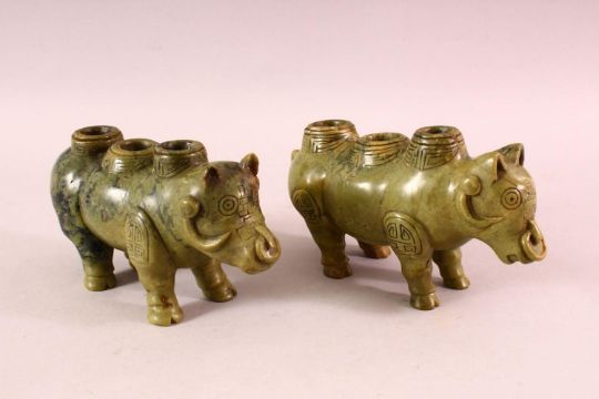 A PAIR OF CHINESE TIBET CARVED SOAPSTONE MYTHICAL BEAST CANDLESTICKS, in the form of beasts,20cm