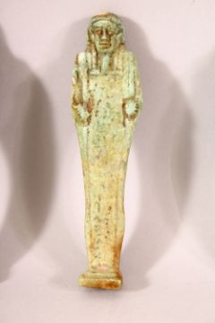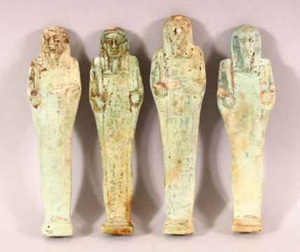 A LOT OF FOUR ANCIENT EGYPTIAN POTTERY USHABTI FIGURES - Each with a turquoise glaze and Egyptian archaic scripture, from private UK collection. 16cm