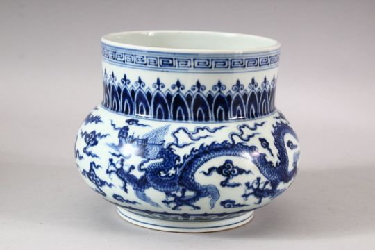 A CHINESE MING STYLE BLUE & WHITE PORCELAIN DRAGON JAR - the underside with a sic character mark, 20cm