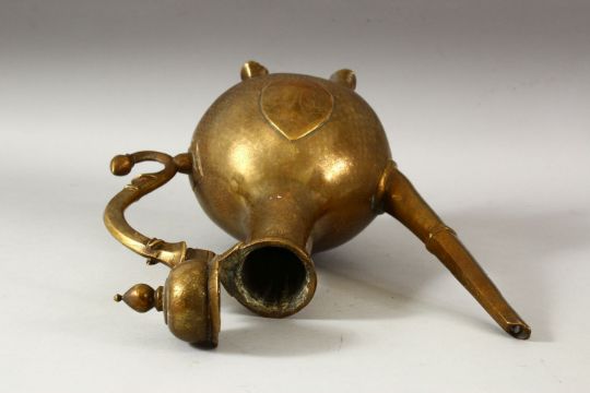 A LARGE 18TH CENTURY MUGHAL INDIAN BRASS EWER, with engraved / chased decoration, 32cm high.