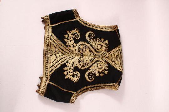 AN OTTOMAN EMBROIDERED BALKANS CHILD WAISTCOAT - with a black ground and gold coloured thread.