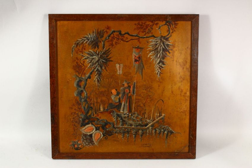 A SET OF FOUR CHINESE CHINOISSERIE PAINTED LACQUER PANELS, two 57cm x 42cm, the other two 42cm x 42cm.
