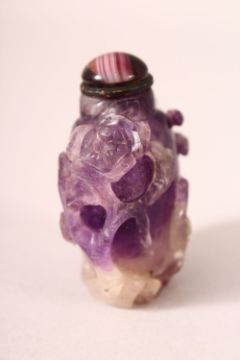 A CHINESE CARVED AMETHYST QUARTZ SNUFF BOTTLE, 5.5cm.