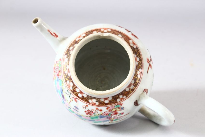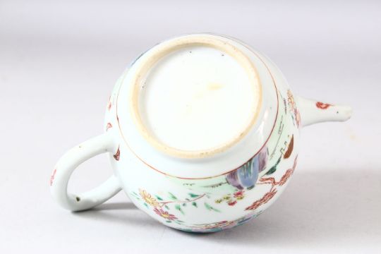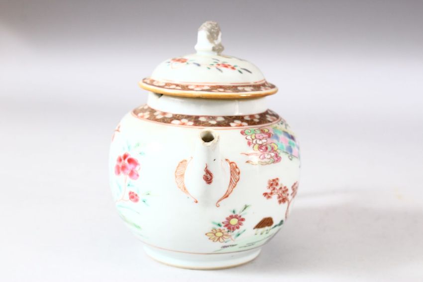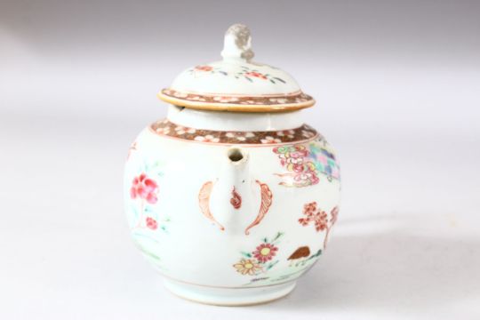 A CHINESE FAMILLE ROSE PORCELAIN TEAPOT AND COVER, painted with a cherry tree and a wall and temple, overall 13.5cm high.