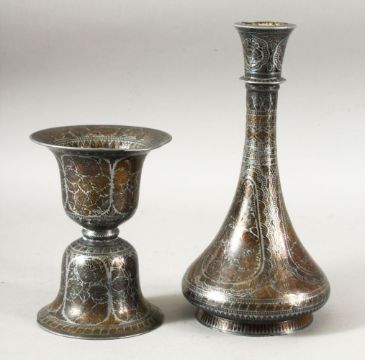 A 19TH CENTURY INDIAN BIDRI SPITOON, 14cm high, together with a bidri vase, 23cm high.