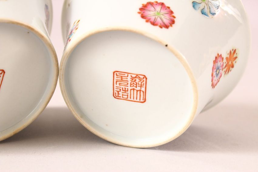 A PAIR OF CHINESE REPUBLIC STYLE FAMILLE ROSE PORCELAIN TEA CUPS, each decorated with floral roundel decoration, the bases with stamped four character marks, 9.5cm diameter.